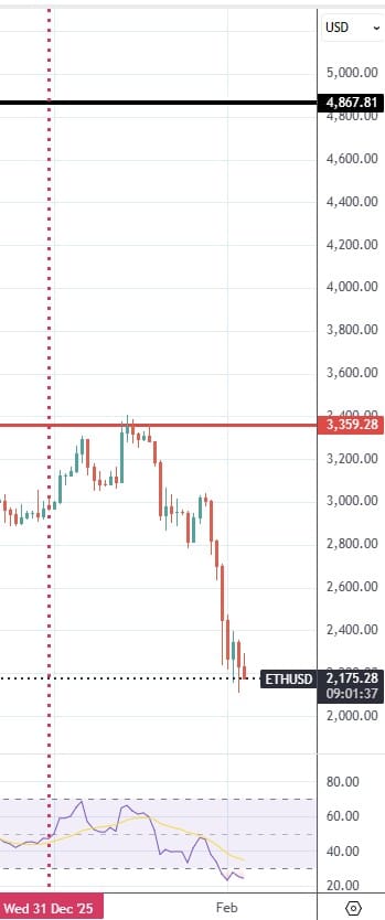 LEFT = ETH Forecast 12/31/25 RIGHT = Actual ETH Prices Since 12/31/25 through 02/04/26