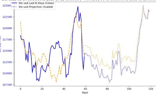 Bitcoin (BTC-USD) shows a projected bottoming pattern after a volatile 3-month compression. The scaled projection implies a recovery phase beginning near $108,000–$110,000, potentially reaching $122,000+ within the 100-day window.